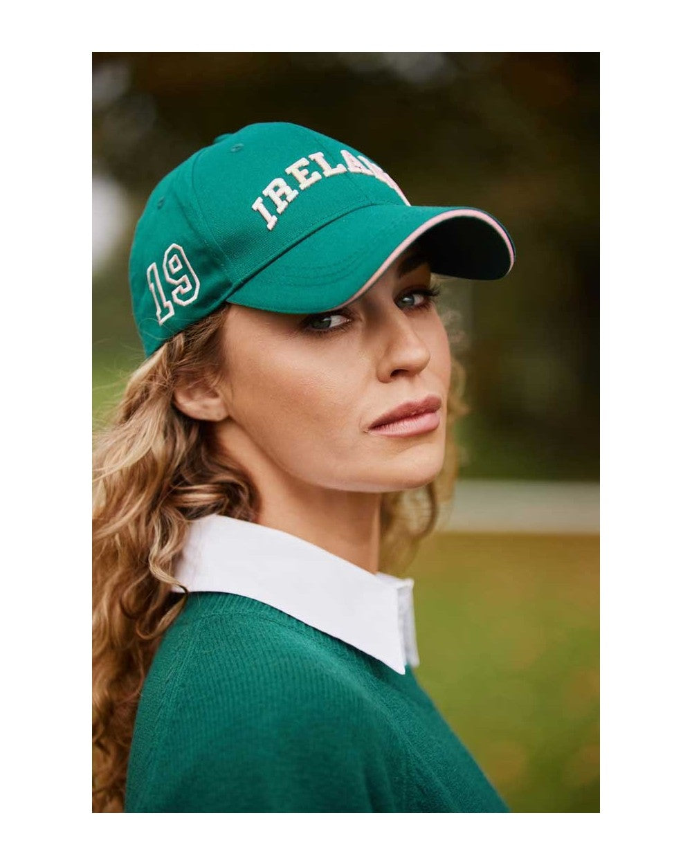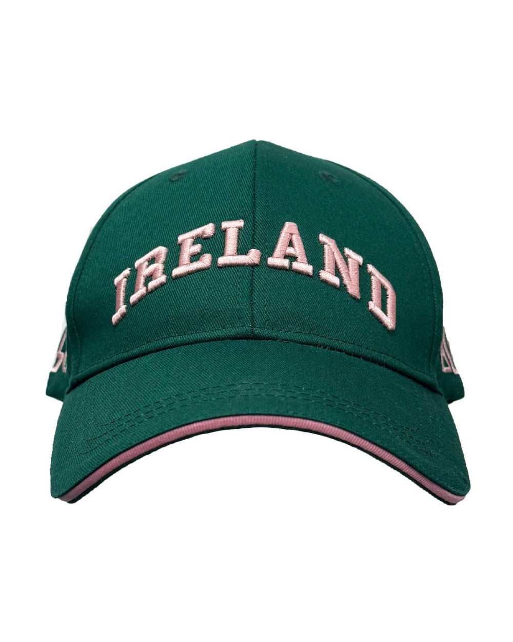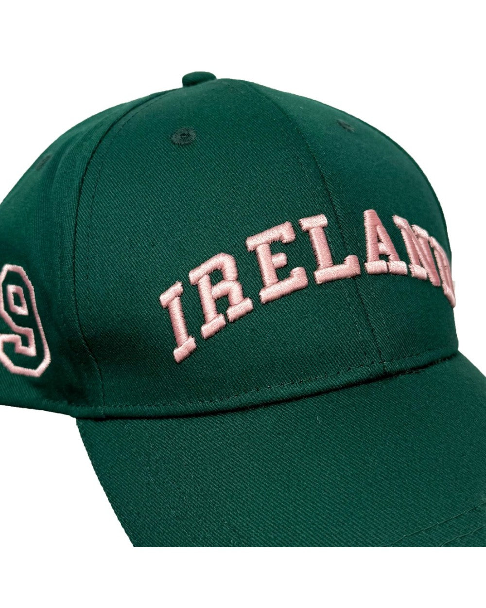 A bold baseball cap combining evergreen and pink tones. Classic shape with modern color contrast. Ideal for casual outfits.